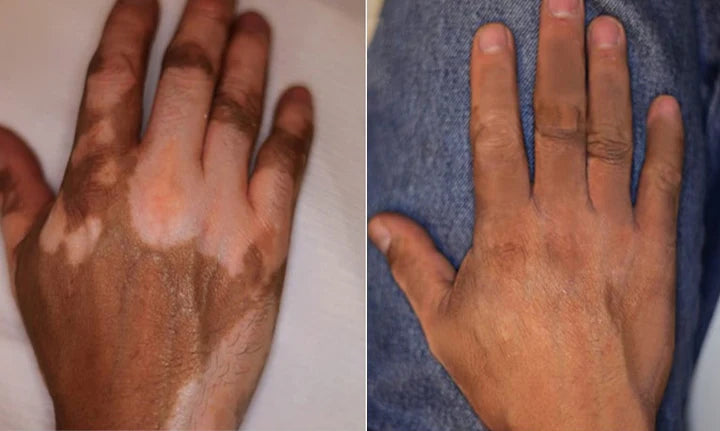 Tras un largo período de estrés y una reacción alérgica, me salieron manchas blancas en ambas piernas, principalmente en los muslos y las rodillas. Probé muchas cosas, pero nada funcionó. Me lo aplicaba todas las noches y, después de dos semanas, empezó a desaparecer un poco. Es lento, pero por fin veo progreso.